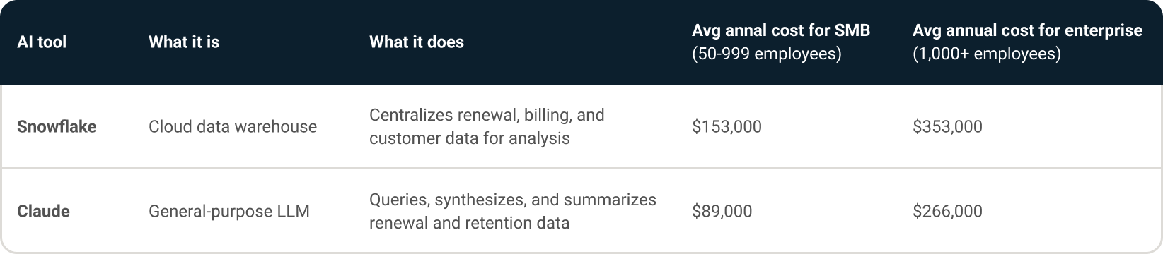 Claude is a general-purpose large language model that finance teams use to query, synthesize, and summarize renewal and retention data once it has been centralized in a data warehouse like Snowflake. As one CFO quoted in SpendHound's 2026 CFO AI Report put it: "Claude just does a great job aggregating and synthesizing information for you quickly." Based on SpendHound's pricing benchmarks, SMB teams typically pay around $89,000 annually for Claude, while enterprise teams pay approximately $266,000.