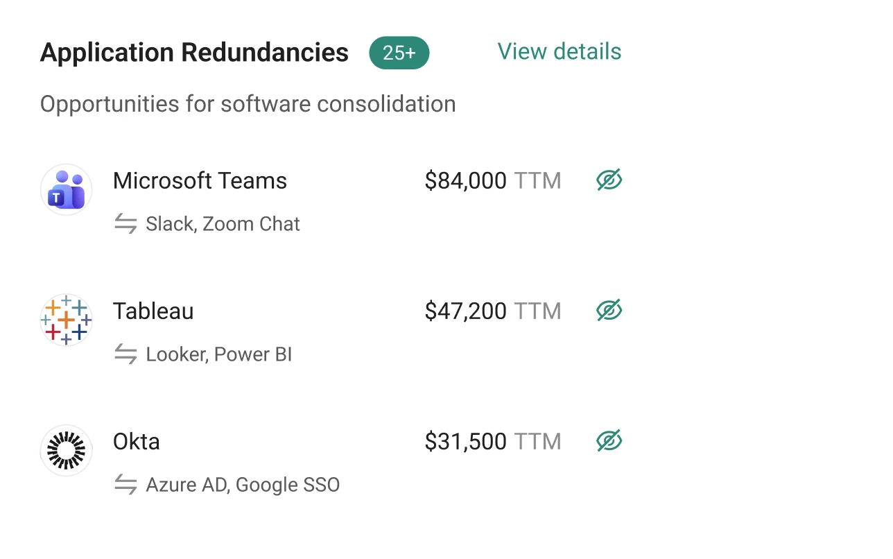 Find the tools no one is using, the overlapping subscriptions wasting budget, and the shadow IT creating security risks. Make consolidation decisions backed by real usage data.